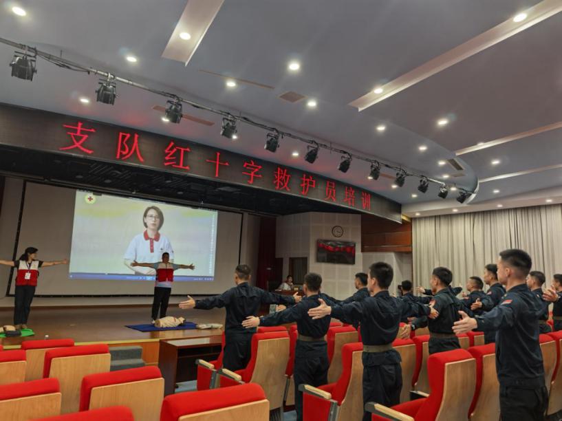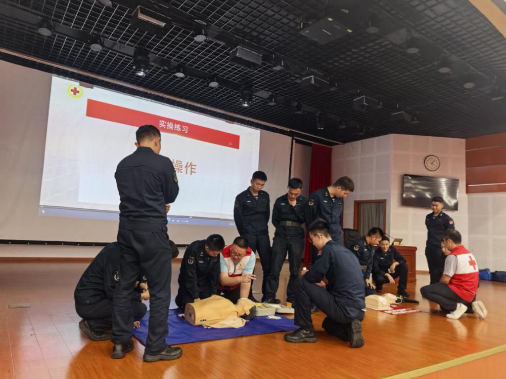 同时,培训现场摆放了3台模拟人,官兵们被分成三组进行实操练习。助教老师逐人进行指导、纠正动作,官兵们个个认真聆听,实操动作干练敏捷,展现了当代军人的高素质。通过线上4课时和线下4课时的学习,60多名官兵全部通过考核。